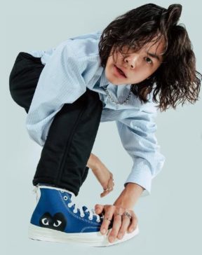 足元はComme des Garçons Play (プレイ・コム デ ギャルソン) × Converse (コンバース) コラボレーション アイテム。